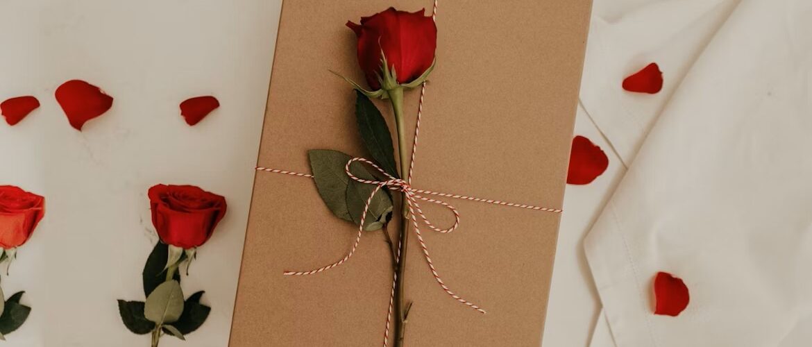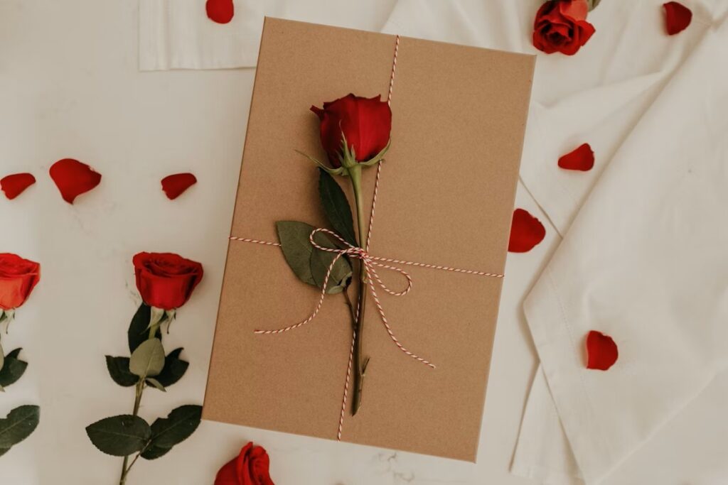 A red rose tied with baker’s twine to a kraft paper gift box. (Photo: Becca Taper )